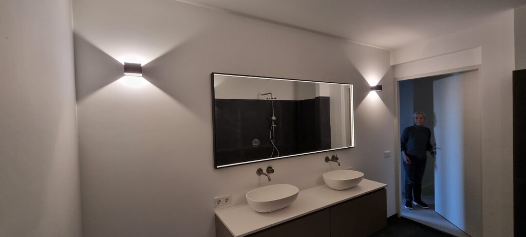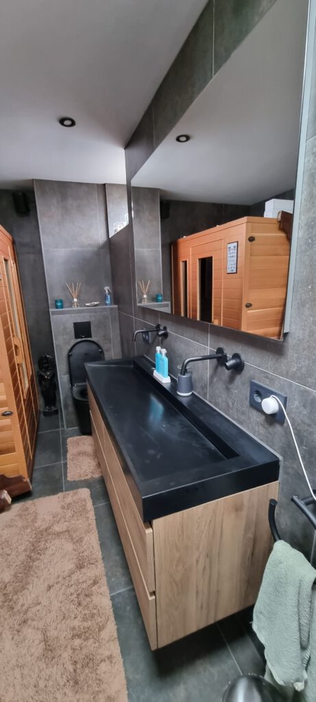 Deze mooie rustige badkamer is een oase van rust en ontspanning. Met een prachtige dubbele wasbak en wandlampen die speciaal ontworpen zijn voor natte ruimtes, biedt deze badkamer u de perfecte plek om te ontspannen na een lange dag. De strakke lijnen en moderne uitstraling maken deze badkamer een echte eyecatcher in uw huis. De wandlampen zorgen niet alleen voor een stijlvolle uitstraling, maar bieden ook nog eens de nodige functionaliteit in een plek waar water en elektriciteit samenkomen. De dubbele wasbak biedt voldoende ruimte voor twee personen om tegelijkertijd gebruik te maken van de badkamer, waardoor u nooit meer hoeft te wachten tot de ander klaar is. Kortom, deze mooie rustige badkamer is de perfecte plek om even tot rust te komen.
